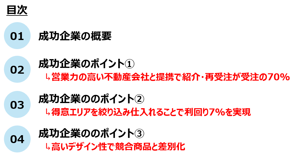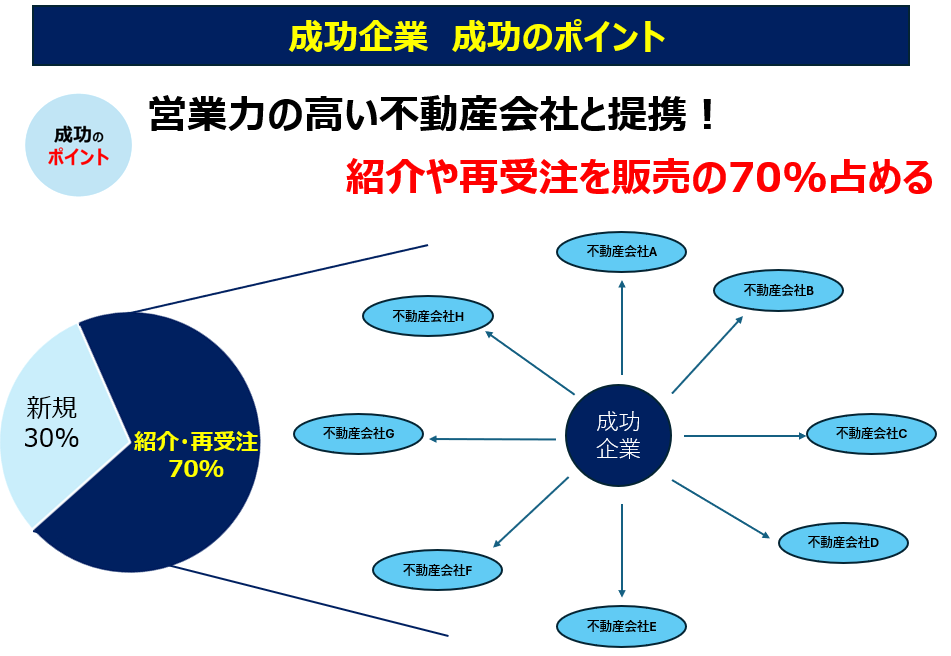 成功企業は建築会社であるため、アパートの販売網の構築が必要でした。そこで、営業力の高い不動産会社と提携することで、紹介やさらに再受注などで建築棟数を拡大し、現在紹介や再受注や受注の70%を占めます。