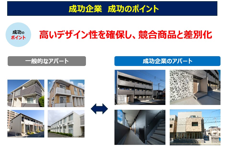 成功企業は3階建てのアパートを中心に建築していますが、デザイン面にも力をいれ、高いデザイン性のアパートを建築し、高利回り×高デザイン性で他社と差別化しています。