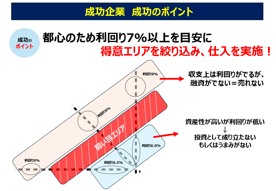 アパートを販売するうえで利回りが最も重要になってきます。特に都心は6%前半の利回りになる物件や利回りが出ても融資がでないエリアがあるなかで、成功企業は利回りを7%に設定し、その利回りを達成するために仕入エリアを絞り込み、ピンポイントで仕入を実施しました。