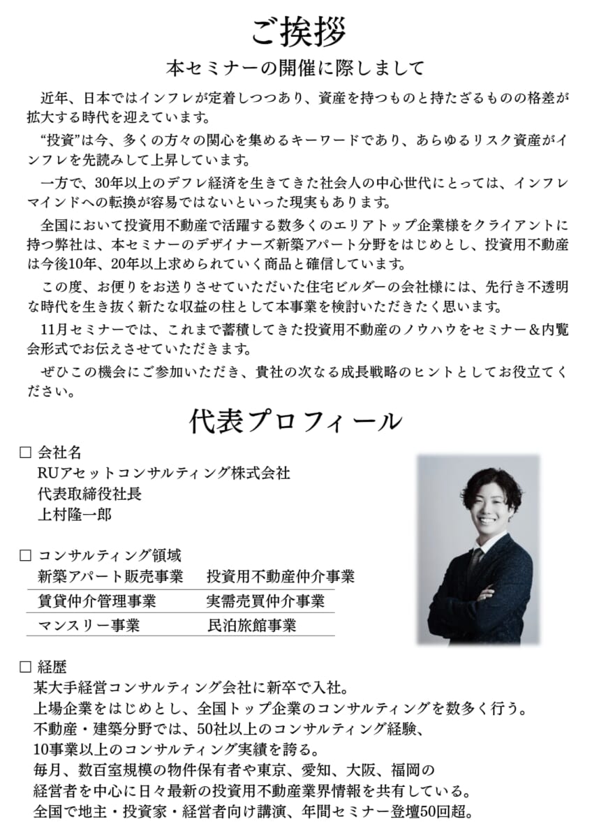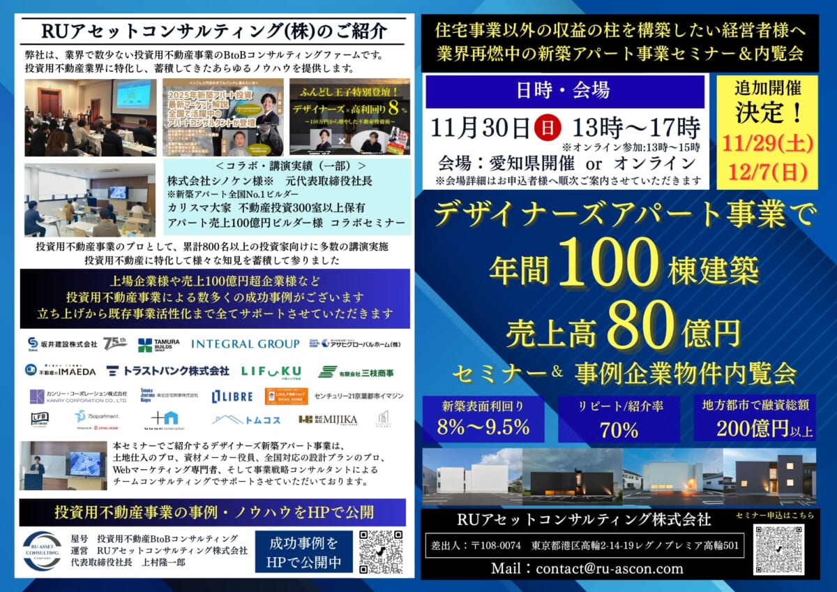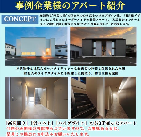 【11/29,30,12/7開催】デザイナーズアパート事業で年間100棟建築売上高80億円セミナー&事例企業アパート内覧会