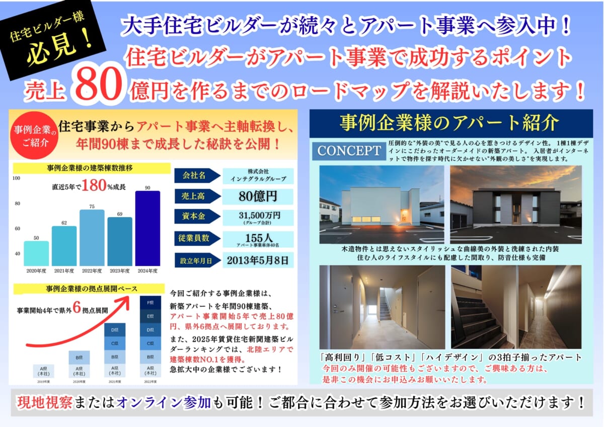 今回開催するセミナーは、 住宅事業以外の収益の柱を構築したい経営者様向けに、 新築アパート事業セミナー&内覧会でございます。 実際にアパート事業で80億円構築された企業様の事例と 事例企業様の物件内覧会を通じて、 アパート事業構築のポイントをお伝えさせていただきます。